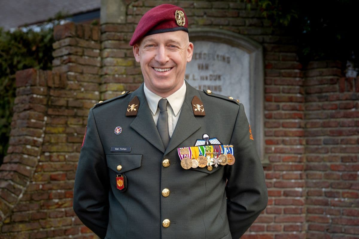 Fotobijschrift: Veteraan majoor Michel van Putten bij het Anjerperkje in Elst.